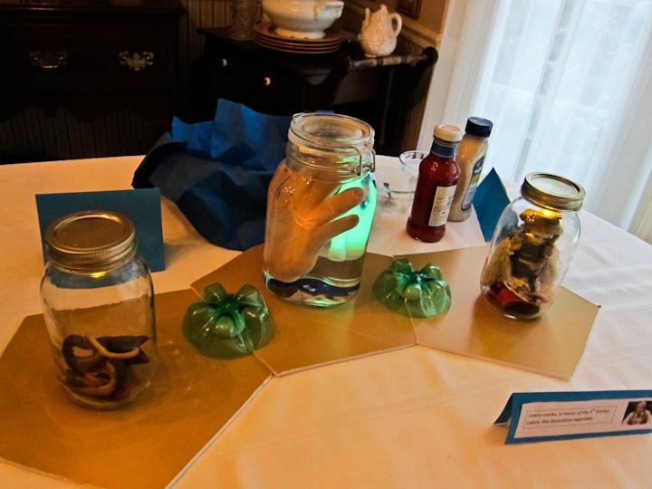 The table runner was made of gold foam board and lined with "things in jars" including a creepy doll, a light-up monster, and the 10th Doctor's severed hand (from a halloween store).